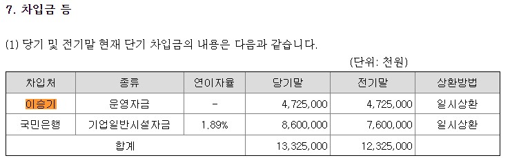 후크엔터테인먼트의 재무제표 및 주석을 봤을 때 단기차입금 47억원이 잡혀있는데 차입처가 이승기입니다.